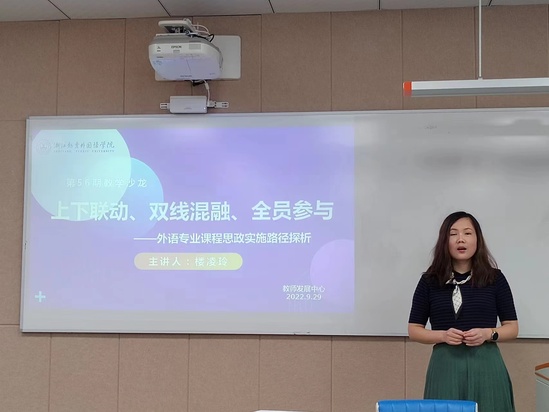 9月29日中午,第56期教学沙龙在稽山校区举行。本次活动由英语学院楼凌玲老师担任分享嘉宾,围绕以“上下联动、双线混融、全员参与式外语专业课程思政实施路径”开展分享,教师发展中心主任费群蝶主持会议,学校近30位教师参加。楼凌玲老师从课程思政的背景切入主题,她强调要推动思政小课堂与社会大课堂相结合,推动各类课程与思政课同向同行,不断增强铸魂育人效果。楼老师从课程思政的本质、课程思政的界域、外语类课程思政的实施路径三个方面展开分享。楼老师首先指出:课程思政是一类课程,更是一种理念,是在课程实施过程中力求实现育人和育才相统一,并最终指向立德树人根本任务的一项有益探索和举措。楼凌玲老师认为综合素养课和专业课都需要课程思政,综合素养课与思想政治教育存在内容上的互通,而专业课教学除了实现育才功能外,还要关注育人作用的发挥。那么,如何推进外语类课程思政建设?楼老师从外语专业开展课程思政改革的有利条件、外语专业开展课程思政改革的难点、外语类课程思政实施路径、外语专业人才的课程思政素养发展阶段、发展模式、内容建设、教学实施、教学空间构建、参与主题这几方面深入展开分享。楼老师告诉我们:外语专业课程教学过程中