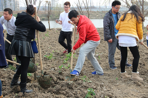 当天揭牌仪式过后,还没等主持人下达“开始”的指令,来自校团委学生会、网络传播学院、英语学院、酒店管理学院、国际学院的学生志愿者们和新葡京官网教官队队员们就已经蠢蠢欲动,迫不及待了。搬树苗、挖坑、填土、浇水……同学们自发组成一个个小分队,有条不紊地展开一道道工序。