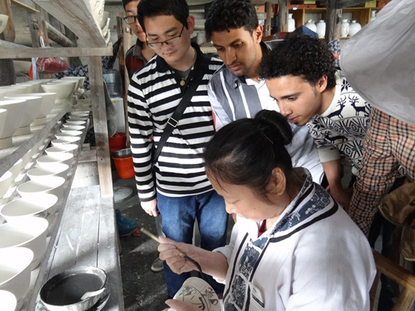 第二天,留学生们来到中国著名的瓷都——景德镇,大家都对这个著名的地方充满了向往。大家饶有兴致地参观了当地古窑,欣赏了各种精美的瓷器,认真观摩了工艺大师做瓷器的过程。来自也门的留学生穆罕默德、越南的阮亭俊、韩国的金泫杜还亲自体验了做瓷器拉坯的过程,并亲手做出了成型的碗和花瓶,他们举着自己的劳动成果,喜不言表。最后,留学生们还欣赏了瓷乐表演,各种瓷器在乐师们的演奏下发出优美动听的乐音,大家静坐在水榭旁,听得入了迷。