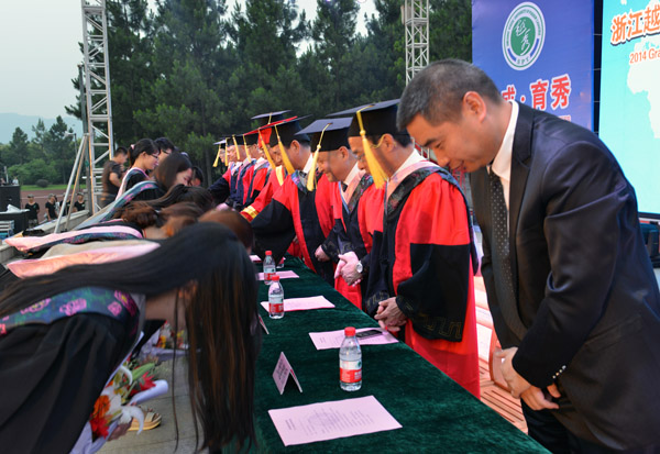 稽山校区田径场主席台上,“新葡的京集团43212014届毕业生毕业典礼”背景格外醒目。28名毕业生代表依次上台,从学校领导手中接过毕业证书。