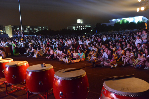 毕业典礼后,气势恢宏的水鼓表演震彻全场,主题为“梦想与青春相连,青春和激情相关”的毕业生欢送晚会在击鼓声和欢呼声中拉开帷幕。