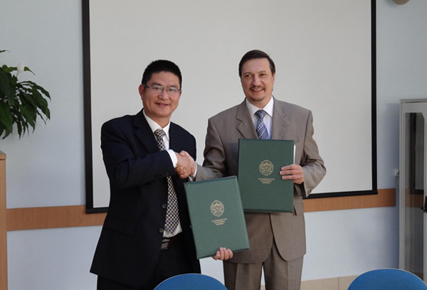 图为单胜江(左)与圣彼得堡国立技术大学签订合作协议