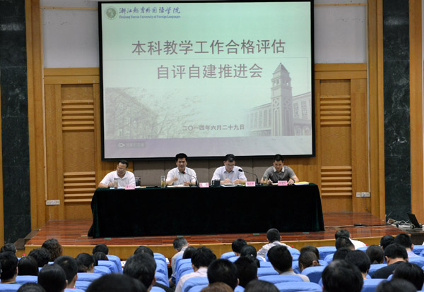 为期一天的会议,议程紧凑,主题明确,意义重大。在当天上午举行的相关处室和各学院专题汇报会上,学校党政办、人事处、教务处、学生处、科研处、财务处、总务处、图书馆、英语学院、东语学院、西语学院、国际商学院、网络传播学院、酒店管理学院主要负责人先后汇报了本部门、本学院的迎评工作现状,存在问题和下一步的解决措施。