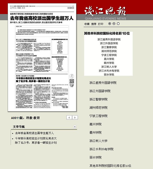 据悉,为直观地了解浙江高校在推进国际化进程中的状况和绩效,便于比较和借鉴,省教育厅委托第三方对全省高校2013年的国际化发展情况进行调查研究,并以《浙江省高等教育国际化发展规划(2010—2020年)》所列的12项国际化指标为依据,对全省普通高校国际化总体水平和单项水平进行了排序,新葡京官网在“浙江省其他本科院校国际化总体水平”排名中以13.60分名列第一,远远高出第二名得分。