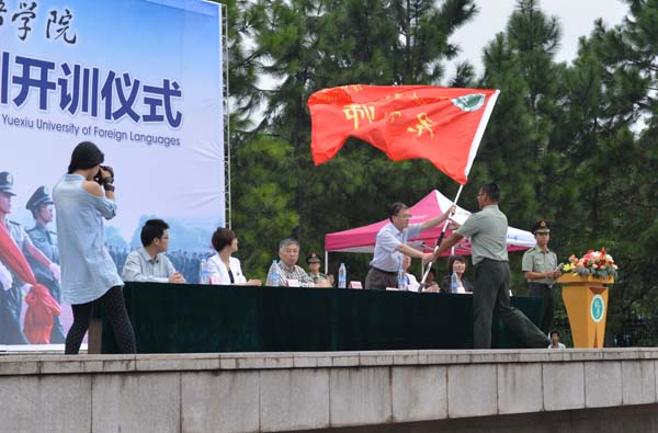 在开训仪式上,军训师师长、学校副校长徐左平授军训师旗并宣布开训,军训师政委、学校党委副书记施文妹颁布军训动员令,各团团长、新生班主任、辅导员悉数参加开训仪式。