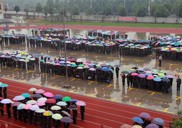 图为雨中军训,五彩花伞成为一道亮丽的风景