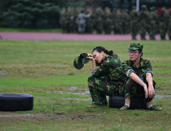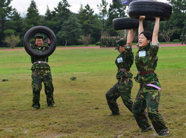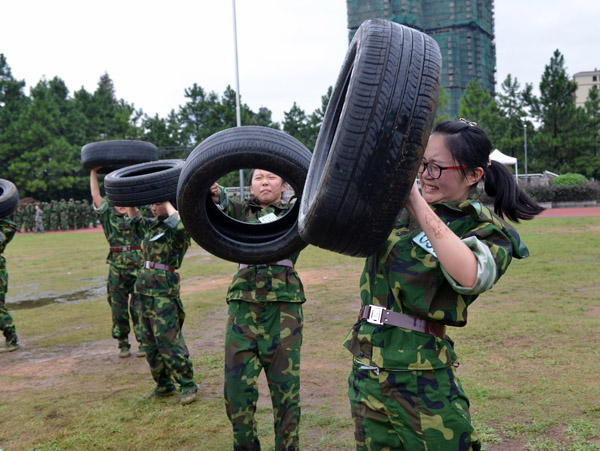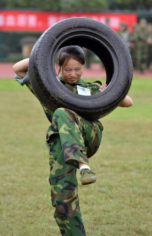 阿拉伯语1402班的赵陈媛是“狼牙”特训营中的一员,身体娇小的她一次次咬牙把轮胎举过头顶,坚持训练。“能坚持到最后吗?”记者抽空问她。“能!因为我们有战友!”