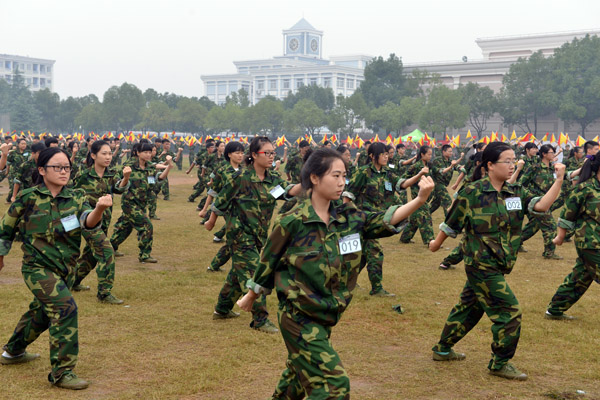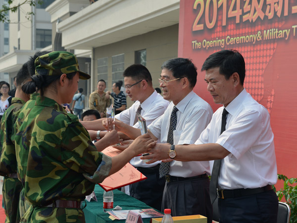 开学典礼上还举行了2014级新生军训总结表彰大会。在为期一周的军训中,全体大学生教官和参训学生上下一致、齐心协力,克服高温、酷暑,发扬不怕苦、不怕累的精神,坚持按规定的程序、内容和时间进行训练,高质量地完成了单兵队列动作训练、站军姿、连队会操考核、“狼牙”特训等多科目训练,并且在军训期间开展了形式多样的活动。检阅现场,队员们身着军装,整齐列队接受检阅,展示一周来的训练成果,力争给自己的大学“第一课”交上一份满意的答卷。“同志们好!”“首长好!”“同志们辛苦了!”“努力成才!”,随着校长徐真华的一路检阅,整齐嘹亮的口号响彻全场,充分展示了新葡京官网2014级新生们积极向上、团结奋进的精神风貌。