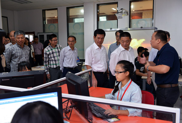 钱建民一行实地踏看了镜湖校区校园、网络传播学院新锐网络传播公司、数字媒体艺术工作室等教学实践场所。在新锐网络传播公司,学生们正在进行网站后台管理、视频剪辑、图片处理等实践操作,钱建民仔细听取介绍并与学生亲切交流,询问学习情况和实践课程安排。在数字媒体艺术工作室,钱建民饶有兴致地观看了由网络传播学院学生拍摄制作的绍兴水城微电影,并鼓励师生要多走出去实践锻炼,用手中的镜头展现绍兴独特的风土人情和水乡魅力,在实践中提高能力。2011年9月,钱建民曾出席“中国互联网新闻信息管理人才培养基地”成立仪式暨网络传播学院开学典礼。此次来校调研,他关切询问网络传播学院办学情况和毕业生就业情况,当得知毕业生就业率高,基本上找到了与自己专业契合度较高的工作时,钱建民点头感到欣慰。
