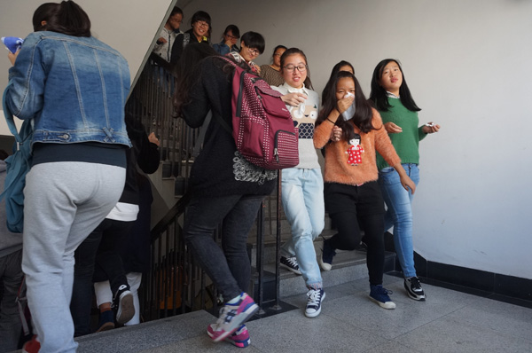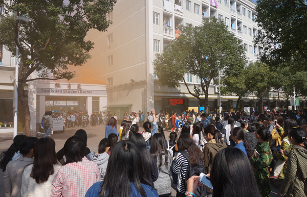 当天中午,根据演练安排,学生公寓内冒出橘黄色浓烟,模拟火灾发生现场,学生看到浓烟后,关闭门窗,迅速进行疏散逃生。疏散过程中,大家用湿毛巾捂住口鼻,弯腰低姿迅速行动。宿管人员迅速拉响警报并马上展开灭火行动。与此同时,学校保卫人员和医护人员也在第一时间赶到现场,立即救护受伤人员。“在此次演练过程中同学们都认真对待,防范意识都有所加强,值得肯定。”保卫处副处长