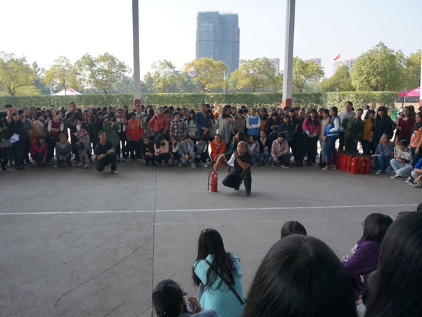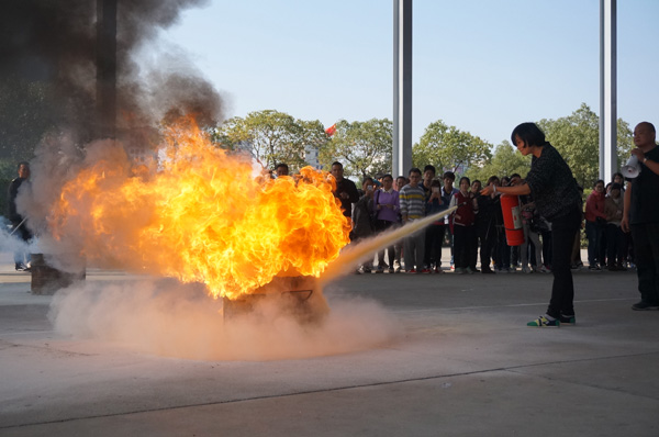 消防安全疏散演练结束后,一场消防培训在风雨操场随即展开,保卫处相关负责人对各楼层长、新生寝室长、学校餐厅员工及各经营负责人就消防安全问题、灭火器种类、使用方式和发生火灾后的处理方法等进行了培训,大家还亲身体验了如何正确使用灭火器灭火实践。“学校举办这种演练活动可以提高我们的自救能力,同时也为提高校园安全稳定打下了基础。”德语1402班的张玉同学在演练后如是说。