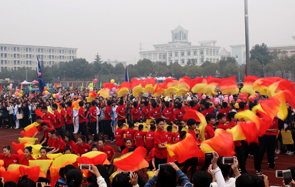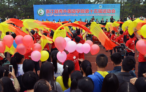 上午8时,隆重热烈的开幕式正式举行。彩旗方队、各学院方队、外籍教师方队、外国留学生方队依次缓缓走过主席台,各方队表演精彩不断、亮点纷呈、富有特色。东方语言学院展示了东方文化独特的韵味,西方语言学院以一段激情四射的弗朗明戈舞燃起了现场观众的狂欢热潮,英语学院变幻出“sports meeting begin”的字样,展示学院特色,国际商学院的敦煌舞随着恢弘的鼓声舞动,尽显异域风情,酒店管理学院则以一身整齐的职业装亮相,展现专业素养,外教方队和留学生方队尽显学校的国际化氛围,带给人一种置身奥运赛场的感觉。
