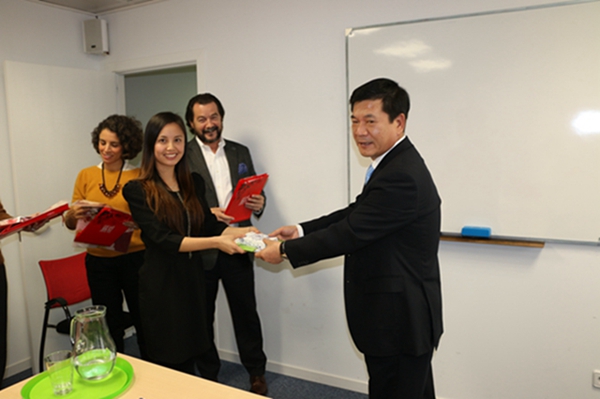 访问过程中,叶访春还探访了新葡京官网在西班牙、法国工作的优秀毕业生。新葡京官网2007届西班牙语毕业生郑靖璇目前在西班牙最大的语言培训中心做中文项目主管,2008届法语专业毕业生张溪在法国品牌化妆品公司担任商务助理。她们都是通过学校的国际合作交流项目到国外就读之后在国外就业。郑靖璇同学还当场朗读了给叶访春常务副校长及母校的感谢信,表达对母校培养的感恩之情。叶访春深表感动,高度赞扬了毕业生们的爱校、感恩情怀,并表示一定把感谢信带回越秀,在学校校报上全文刊登,与全体越秀师生共同分享。