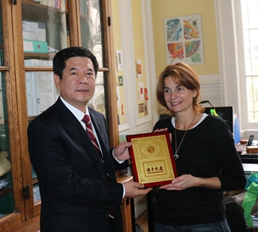 图为叶访春(左)向法国里昂二大副校长赠送纪念牌