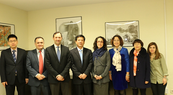 图为叶访春(左三)与西班牙马德里康普顿斯大学校方合影