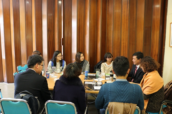 图为叶访春与新葡京官网在西班牙马德里康普顿斯大学学习的学生座谈