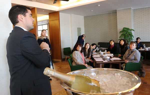 左手拖住瓶身,用右手缓缓把酒倒入杯中……12月17日下午,酒店管理学院在校内酒店综合体举办了一场别开生面的葡萄酒品鉴会,8名酒店管理专业的学生分成两组,在西班牙菲斯奈特葡萄酒公司(Freixenet)中国区销售总监Alberto Hutard先生的指导下,为20位老师表演了一场葡萄酒倒酒和品鉴艺术。