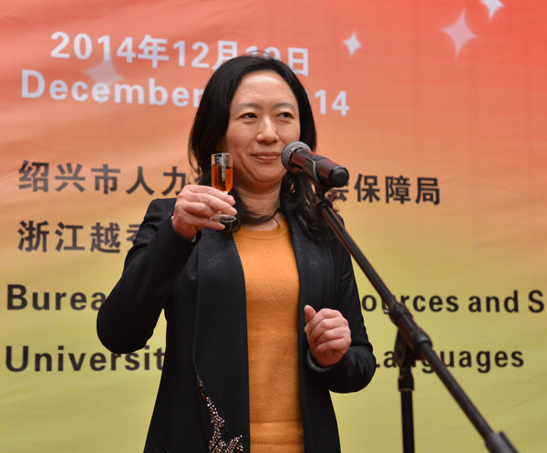 市委常委、副市长姚远致祝酒词,感谢外国专家们对绍兴发展所作出的贡献并向大家致以节日的祝福。学校常务副校长、党委常务副书记叶访春代表学校致新年贺词,向全体外籍教师致以亲切的问候和新年的祝福,向关心、支持“越秀”建设发展的朋友表示衷心的感谢和崇高的敬意。在全场共同举杯、互致祝福的友好氛围下,联谊晚会正式开始。四位主持人用中外文穿插主持,让晚会一开场就有了浓浓的异国风情。