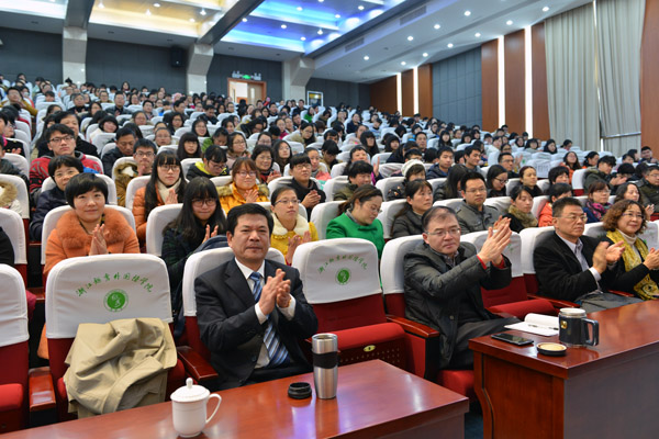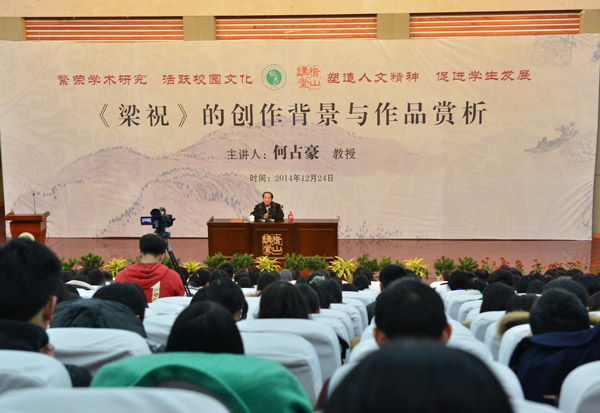 何占豪教授的讲座受到了师生们的热烈欢迎。当天上午9:08,学校官方新浪微博提前预告了何占豪教授来校作讲座的信息,短短3个小时阅读量超过6000人次。“今天何教授用朴实的话语再现了《梁祝》当时的创作背景,几个例子让我更深理解了真正的西洋乐器民族化的含义,也使我对乐器产生了特别的兴趣,以后听《梁祝》的时候让我有了另一种更加亲近和真切的情境。”英语1305班王莹同学在听完讲座后颇有感慨。