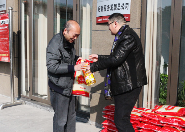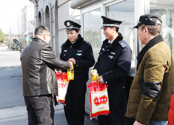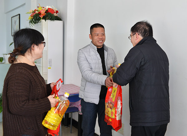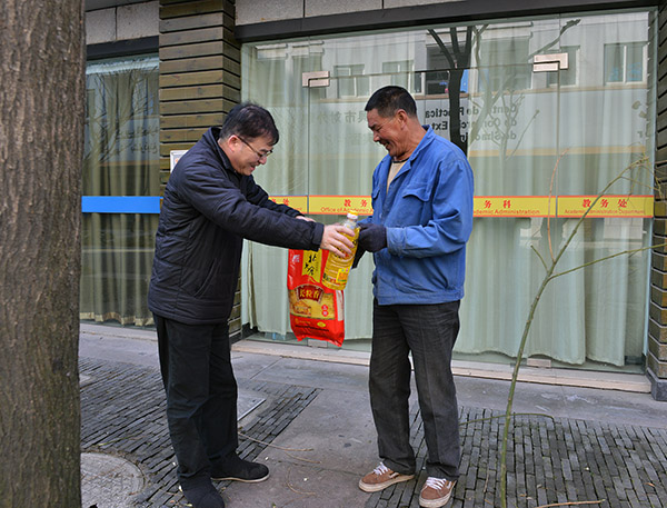 稽山校区SPT行政服务街上,后勤绿化师傅胡柏潮正专注着整理刚剪下来的树枝,一辆车子缓缓在他旁边停下,副校长徐左平下车快步走上前,“胡师傅,新年好!”随即送上了学校的新年慰问品。胡柏潮惊喜之余连声说“谢谢”。