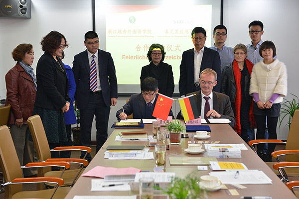 当天上午,执行校长詹文都和慕尼黑应用语言大学校长Felix Mayer分别在合作协议书上签字,共同开启两校合作之路。