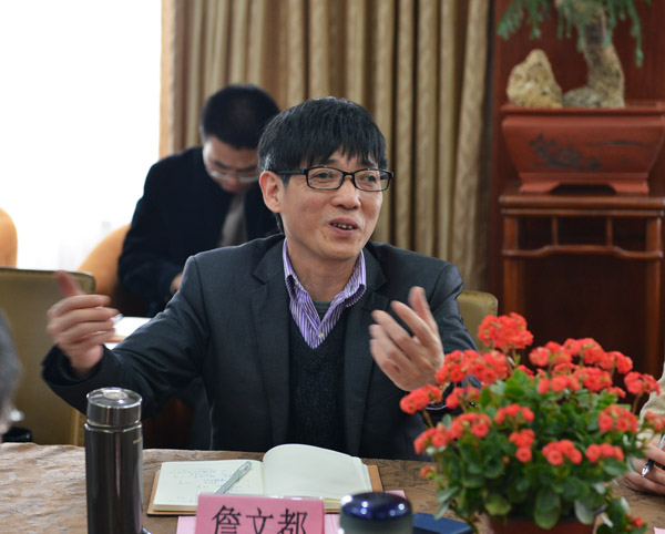詹文都认真听取每一位博士的发言,并对老师们提出的一些困惑和问题当场作了详尽解答,不时插话就大家集中反映的关于教学安排、课程设置、教师培训、图书资料建设等方面的工作