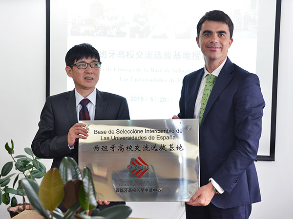 会上还进行了“西班牙留学申请中心-西班牙高校交流选拔基地”授牌仪式,胡安·卡洛斯向詹文都授牌;双方还互赠纪念礼品。