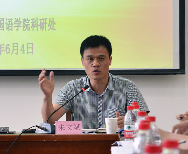 副校长朱文斌主持会议,科研处负责人,各学院主管科研的院长(副院长),校级及以上重点学科带头人、学科秘书参加会议。