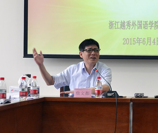 詹文都指出,学科建设要与科学研究(特别是高水平、高显示度的学术成果)、协同创新有机结合,选好学科方向,凝练学科特色,共同做好学科建设与人才培养、服务社会密切协同的大文章,以学科建设的新成果提升越秀的社会服务水平。要抓住国家实施“一带一路”战略的契机,立足浙江的外向型经济和国际化发展,整合越秀的多外语、经管、网络传播等学科特色、人才优势和国际化水平较高的比较优势,着力打造好网络传播研究院和海外经济文化研究院等若干个有特色、有影响的重点研究基地和高端智库,积极向省委省政府、省直相关厅局、绍兴市、产业集团提供决策咨询、发展战略研究服务,提升越秀的社会影响力和知名度。