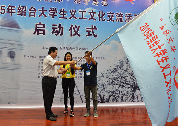 绍兴市人民政府副秘书长马民上台为两岸大学生义工代表授旗;绍台两地的大学生还分别带来了家乡的水和土,两岸学生代表在台上将水土互相融合,寓意着两岸同源同根,一脉相承。