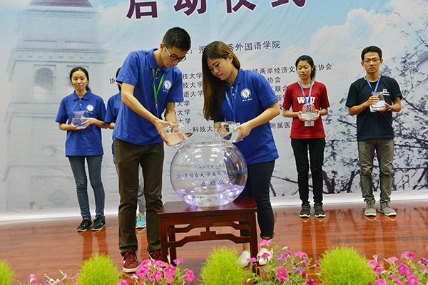 6名来自新葡京官网和台湾高校的学生代表缓缓地把从海峡对岸带来的水土和大陆的水土相互交融,寓意两岸同源同根,一脉相承。6月29日下午,“血脉文脉·携手志愿”2015年绍台大学生义工文化交流活动启动仪式在稽山校区图书馆报告厅隆重举行,随着执行校长詹文都和浙江省台办副主任陈正仁、浙江省教育厅港澳台事务办公室调研员钱晓晴、绍兴市人民政府副秘书长马民、绍兴市教育局局长贺晓敏和两地大学生义工代表共触启动球,为期10天的绍台大学生义工文化交流活动正式拉开帷幕。