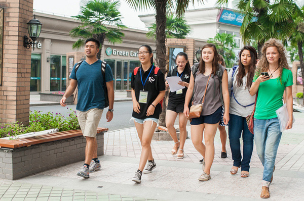 图为新外教在外事学生义工的带领下参观稽山校区