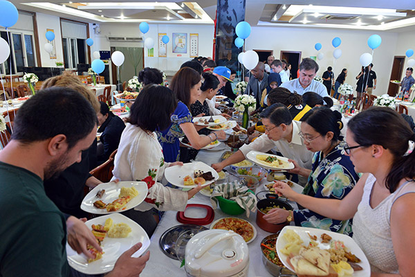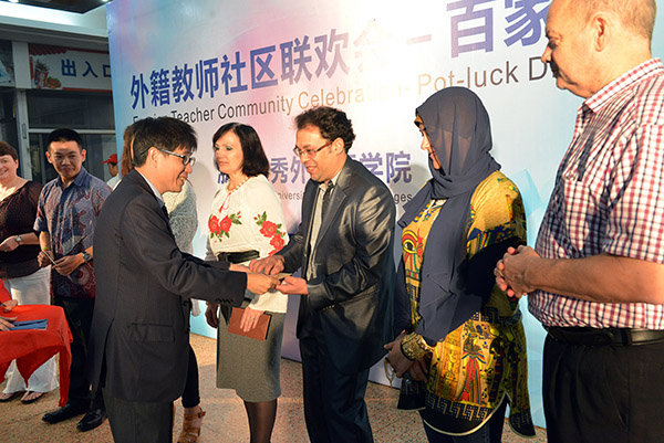 仪式环节后,全场一起品尝外籍教师们自行烹制的各国传统美食,用世界美食连接中外友谊。期间,詹文都在外事处负责人的陪同下一一向外籍教师送上问候,感谢他们为学校国际化师资队伍建设、国际化课程开发和校园国际化氛围的营造所做出的积极贡献。