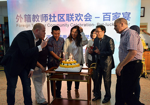 当晚联欢会现场,与会人员还为8名10月份生日的外教过了一个简单而温馨的集体生日,詹文都代表学校向他们送上了学校精心准备的生日礼物和温暖的生日祝福。
