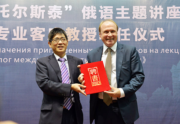 图为詹文都向乌拉基米尔·托尔斯泰颁发客座教授聘书