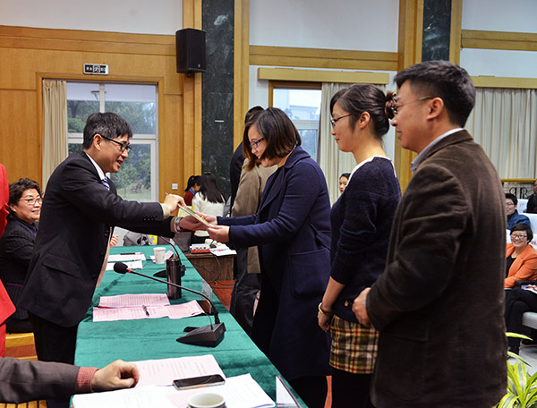 会上还表彰了2015年招生就业工作先进集体和先进个人,李建平宣读表彰文件,招生先进集体代表国际商学院、就业先进集体代表英语学院和网络传播学院分别作了经验分享。会上还举行了2016届毕业生就业工作质量目标责任书签订仪式,詹文都代表学校与各学院负责人分别在责任书上签字。
