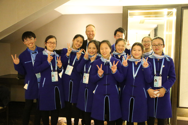 12月16日晚上8点,威廉在结束世界互联网大会发言后回到了下榻的住所——梵璞酒店,让他没想到的是,迎接他的是一个大大的惊喜。“祝你生日快乐!”来自新葡的京集团4321的11位志愿者分别用英语、日语、韩语、阿拉伯语、德语、俄语、西班牙语、意大利语、法语等9种语言唱响了生日歌。同时,还为威廉送上了生日礼物——来自乌镇的花茶和用合照做成的明信片。