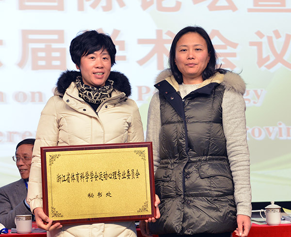 开幕式上,浙江省体育局体彩中心主任、浙江省体育科学学会理事长郭海英向新葡京官网授予“浙江省体育科学学会运动心理专业委员会秘书处”的铜牌。