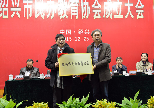 绍兴市教育局副局长石鑫炯向首任会长詹文都授牌。
