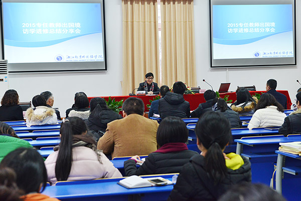 1月7日下午,学校在行政楼会议室召开2015年度专任教师赴国(境)外访学进修总结分享会。执行校长、党委常务副书记詹文都作重要讲话;副校长李建平、何建乐、朱文斌、徐左平,党委副书记施文妹,副校长娄华水,纪委书记朱小农出席会议;教务处、科研处、人事处、外事处负责人,各学院分管教学副院长、办公室主任、教师代表参加会议。