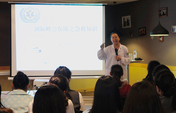 紧张而充实的培训会在早上八点准时开始,来自峰会卫志部志愿服务组招募培训部副部长王海涵老师开始第一讲。从志愿者称号的起源到社会普遍认可的志愿者概念,从本次峰会志愿者具体的岗位分配到大会组委会对志愿者的考核标准,王海涵老师一一娓娓道来。“有些领导人可能比较善谈,你们可以聊一些有趣的事,比如中国的文化,杭州的景点、美食等,杭州西湖、雷峰塔都可以作为聊天的话题。”王海涵老师说。