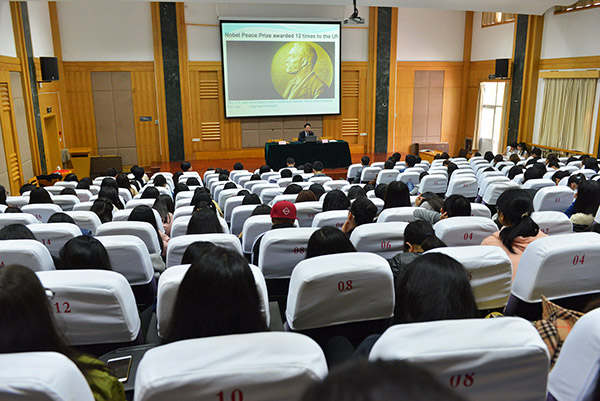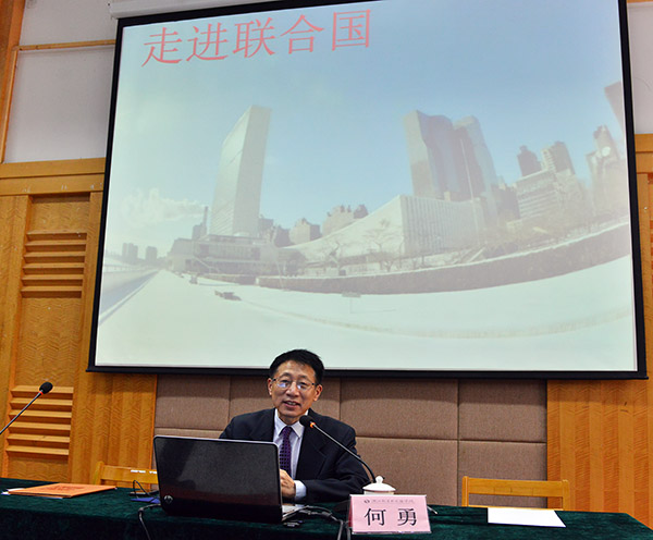 聘任仪式后,何勇教授为现场师生作了题为《走进联合国》的学术讲座,从联合国大会、安理会、经济及社会理事会、秘书处等机构的组织架构、创办宗旨及目标等方面为师生们作了详细介绍,并与大家进行了现场互动。
