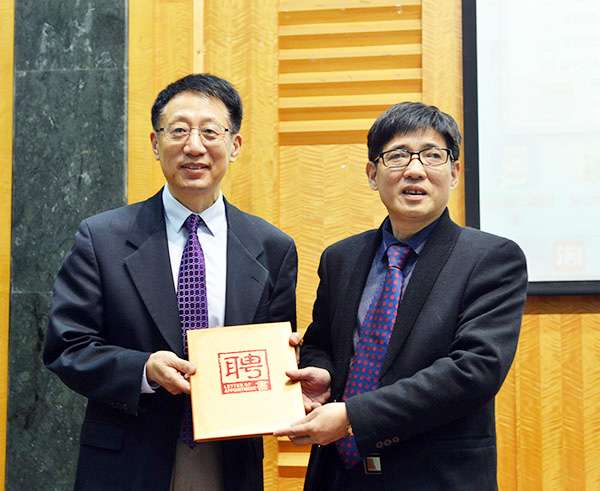 图为詹文都执行校长(右)为何勇教授颁发聘书