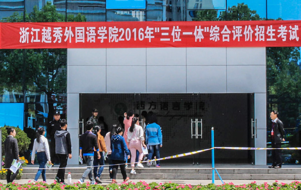 考试当天,现场秩序井然,考生们在检录处报到后按照程序有序进入考场。记者在现场了解到,大部分考生在考前都作了充足准备,临场表现都较为从容淡定。不少考生是与同学一起来到考场,但更多的是家长陪同前来。温州考生章旖旎和杨畅畅当天5:30就起床,不到7:00就来到考试现场,她们报考的分别是新葡京官网的俄语专业和朝鲜语(韩语)专业。“我大学想学外语专业,越秀的外语教育比较好,看到有俄语专业在招生,我就报名参加了,而且参加‘三位一体’考试也多了一次高考选择的机会,这样的形式挺好。”章旖旎表示。