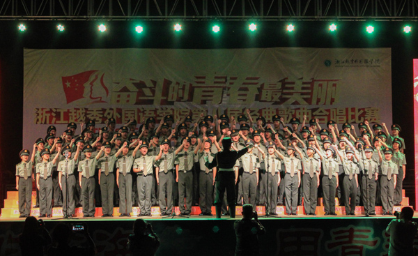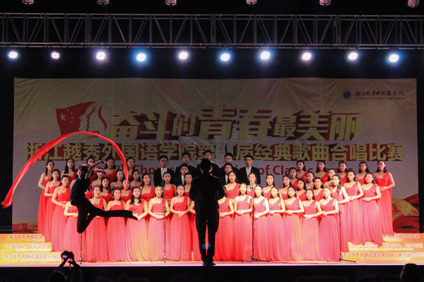 炫酷的舞台,耀眼的灯光,当柔情的音乐声缓缓响起,原本掌声不断的观众席瞬间安静。英语学院代表队以一曲深情的《Memory》迅速将现场观众带入音乐萦绕的浪漫之夜;当《贝加尔湖畔》熟悉的旋律响起,所有的观众屏住了呼吸,网络传播学院代表队的演唱仿佛将观众带到了那微风习习的湖畔;国际学院《保卫黄河》那穿透耳膜的合唱将现场千名观众的热情调动了起来;酒店管理学院以形式新颖的表演,打动人心的声音组合吸引了观众眼球,一曲《我和我的祖国》把对祖国的无限热爱表达得淋漓尽致;西方语言学院一首《弹起我心爱的土琵琶》把现场观众带入了美妙的音乐世界里,让大家跟随着队员们的节奏,享受音乐带来的快乐。大学生教官队的《当祖国召唤的时候》、国际商学院的《迎风飘扬的旗》、东方语言学院的《中国有我》和中国语言文化学院的《在太行山上》则让比赛掀起了一次次高潮,引发全场大合唱。队员们唱出了雄壮的豪情,唱出了真挚的柔情,唱出了激昂的青春,唱出了美好的梦想,当一曲终了,现场的掌声与尖叫声铺天盖地而来,久久回荡在比赛现场。