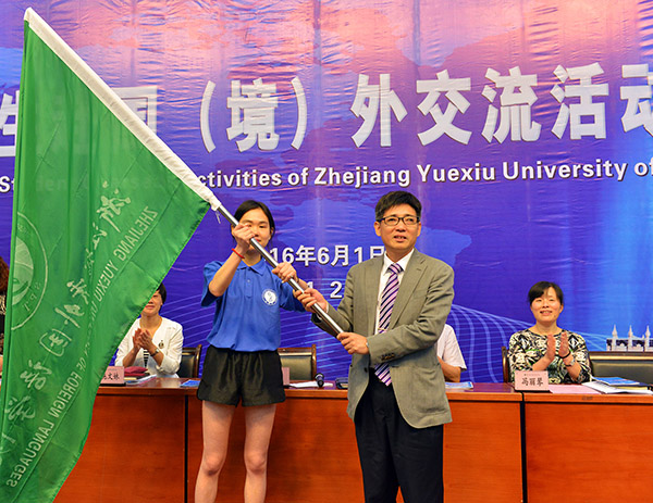 詹文都向学生代表授旗,寄语学生认真学习、开拓视野、学有所成、平安凯旋。