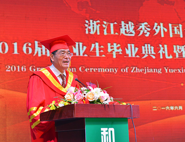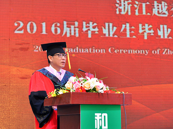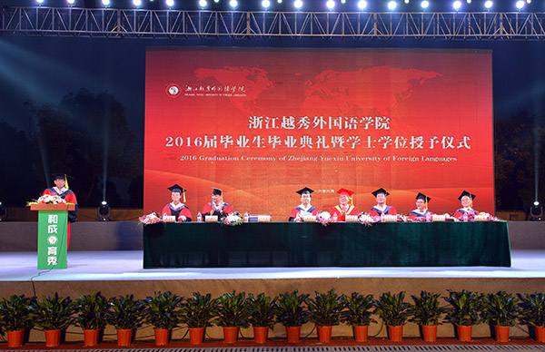 徐真华校长代表学校致辞并为毕业生代表一一拨穗;执行校长、党委常务副书记詹文都主持毕业典礼;绍兴市教育局副局长钱伟平和学校领导共同为毕业生代表颁发毕业证书;党委副书记施文妹宣读学校2016届本科毕业生毕业、授予学士学位的决定和关于表彰2016届优秀毕业生的决定文件。