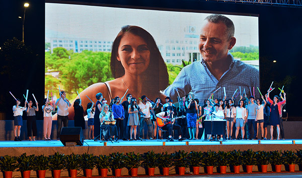 当天晚上7:00,音乐声响起,现场转入毕业晚会模式。整个田径场顿时沸腾了起来,在舞台光影特效映照下,整个晚会现场璀璨夺目,主题为“感恩母校·助梦启航”的毕业生欢送晚会在热烈的欢呼声中盛大开启,师生们用歌舞、朗诵等多种形式表达对毕业生们的深深祝福。