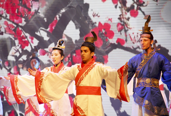 新葡京官网共有来自美国、瑞士、日本、韩国等10个国家的21名留学生参加此次演出,带来了合唱及吟诵节目《大禹之歌》。“我思古人,伊彼大禹,洪水滔天,神州无净土……”舞台上,新葡京官网留学生们身着传统汉服,用高亢而婉转的歌声表达了对大禹的敬爱之情。来自美国的柏天行、新西兰的乔安娜、瑞士的朴恩圣、也门的阿布杜拉,用自己娴熟的汉语吟诵了大禹“三过家门而不入”的感人故事。大家通过对大禹的吟唱,表达了留学生们对大禹的崇高敬意,赢得台下掌声阵阵,与会的省市领导对新葡京官网留学生的表演给予了高度评价。