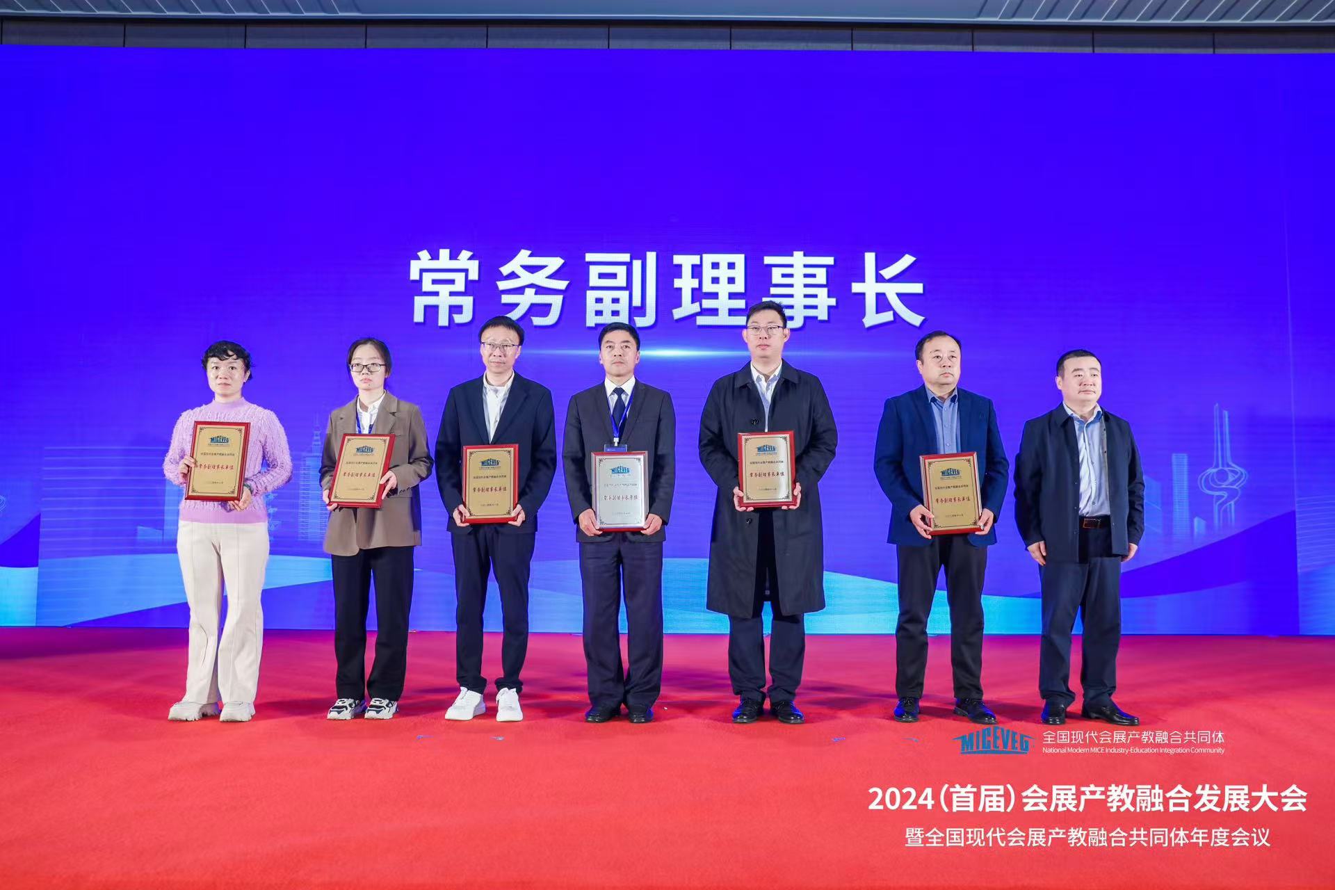 会议现场,与会领导为全国现代会展产教融合共同体(以下简称“共同体”)理事长单位、常务副理事长、副理事长单位授牌,并为共同体秘书长、专家委员会专家颁发聘书。新葡京官网作为常务副理事长单位之一参加了授牌仪式,酒店管理学院尚云峰院长担任常务副理事长、会展经济与管理专业负责人任国岩教授受聘为专家委员会专家。